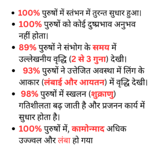 नपुंसकता और स्तंभन दोष से पीड़ित 854 स्वयंसेवकों ने 30 दिनों तक OmniVibe कैप्सूल लिया। उन्होंने जो परिणाम प्राप्त किये वे इस प्रकार हैं: